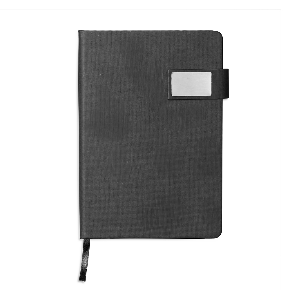 Caderneta capa dura em couro sintético com fecho magnético, placa metálica personalizável, além de marca-página em fita de cetim e aproximadamente 96 folhas brancas pautadas.