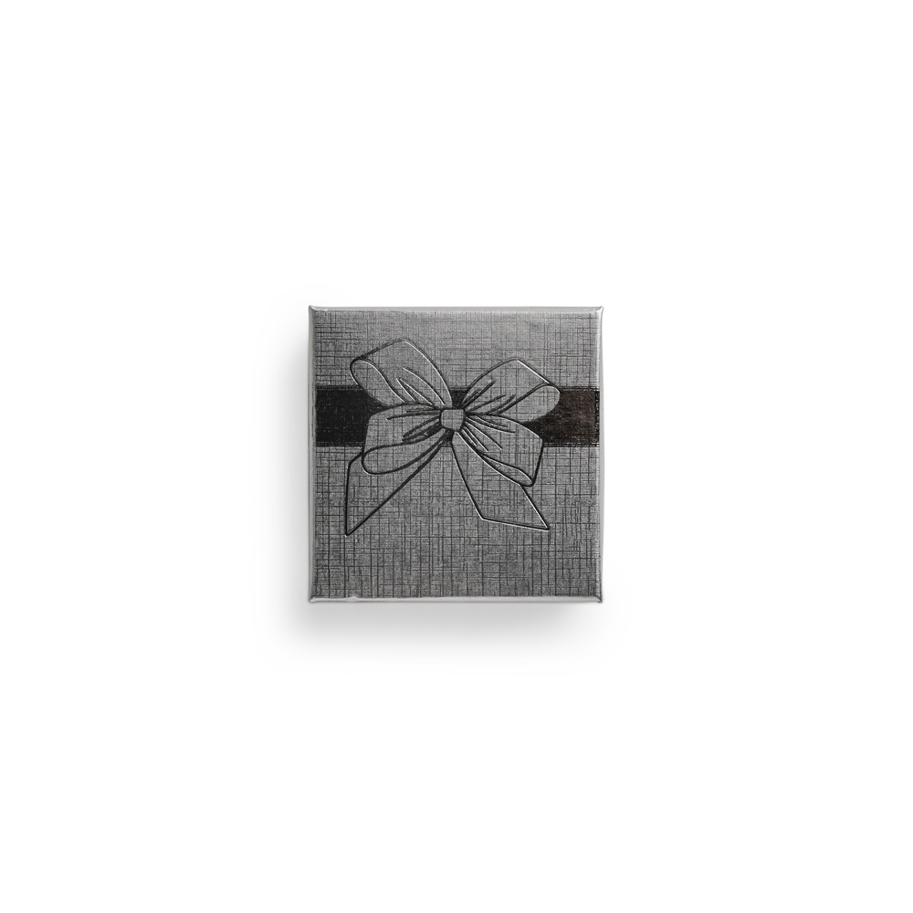 Caixa para presente compacta em papelão com acabamento levemente texturizado e ilustração de laço na tampa. Acompanha berço removível em espuma com ranhuras.