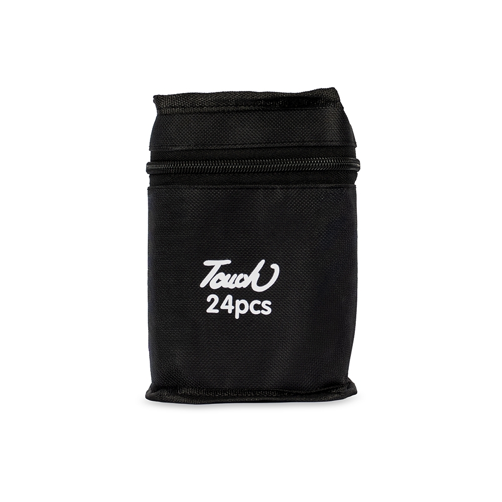 Um kit com 24 canetas marcadoras com pontas duplas: uma fina e outra chanfrada grossa. Cada uma das canetas possui corpo leve em plástico, projetado com foco na ergonomia, o que torna seu manuseio simples e agradável até mesmo em períodos prolongados. Este é um conjunto que, através de toda a sua versatilidade com as pontas e a variedade de cores, traz todas as possibilidades criativas para pintar, desenhar, escrever ou marcar textos. Acompanham bolsa para facilitar o transporte do kit.